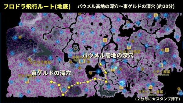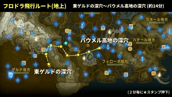 フロドラの角を収集するために、フロドラに乗って2分毎にスタンプを押してみました。東ゲルドの深穴~バウメル高地の深穴の間を約34分で1週しています。